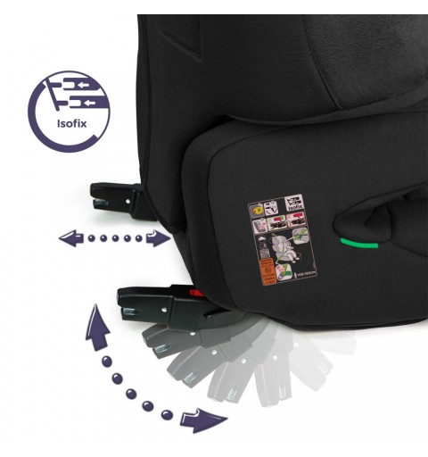 Regulowane złącza Isofix ułatwiają montaż fotelika. Kolorowe wskaźniki na złączach umożliwiają weryfikację poprawności montażu.