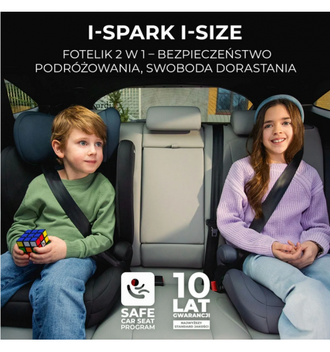 I-SPARK i-Size 2w1 to nowoczesne rozwiązanie dla rodziców, którzy cenią nie tylko kompleksowe bezpieczeństwo, ale i funkcjonalność. I-SPARK i-Size jest przeznaczony dla dzieci o wzroście 100-150 cm (od ok 3,5 do 12 lat) i jest zgodny z najnowszą normą bezpieczeństwa R129 i-Size. Został przetestowany w prędkościach zwiększonych aż o 28%. Pozwoliło to na dokładniejsze sprawdzenie odporności skorupy fotelika na pękanie, ponieważ działa na nią o 50% większa energia kinetyczna.