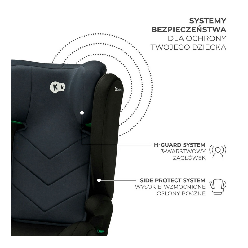 Może być używany bez oparcia, jako podkładka dla starszych dzieci w zakresie 140-150 cm wzrostu: wystarczy odczepić oparcie, jeżeli Twojemu dziecku jest już niewygodnie w foteliku. Podkładka jest przetestowana i zgodna z najnowszymi standardami, również z normą i-Size. Fotelik ma dedykowane systemy bezpieczeństwa, które wzmacniają konstrukcję i rozpraszają energię, powstałą w wyniku uderzenia: H-GUARD oraz SPS sprawiają, że nie dociera ona w swojej pełnej sile do ciała małego pasażera. Oprócz tego zagłówek ma aż 10-stopniową regulację wysokości - możesz go ustawić przy pomocy jednej ręki.