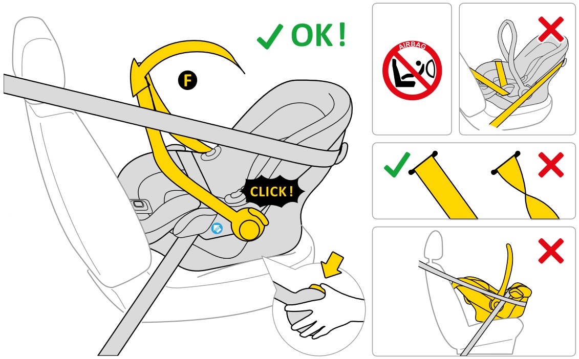 - Po poprawnym zamontowaniu fotelika rączkę do trzymania nosidełka należy ustawić jak najbliżej oparcia na kanapie samochodowej F.