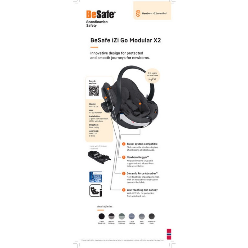 BeSafe iZi Go Modular X2 i-Size chroni Twoje dziecko. Ulepszona ochrona boczna (SIP+), przewyższa standardy homologacji R129. Dzięki unikalnej technologii Dynamic Force Absorber™, ulepszonej ochronie bocznej (SIP+) oraz wkładce dla noworodka, fotelik iZi Go Modular X2 i-Size oferuje bardzo dobrą ochronę Twojego dziecka.