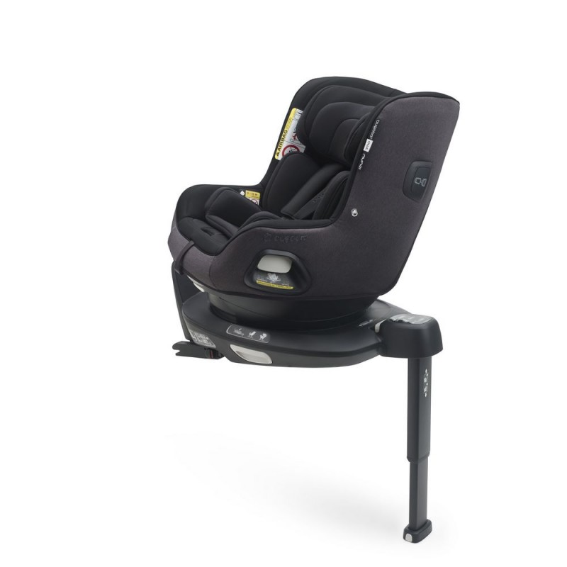 - Baza jest obrotowa, dzięki czemu zapewnia maksimum komfortu w czasie wyjmowania i wkładania dziecka do fotelika.