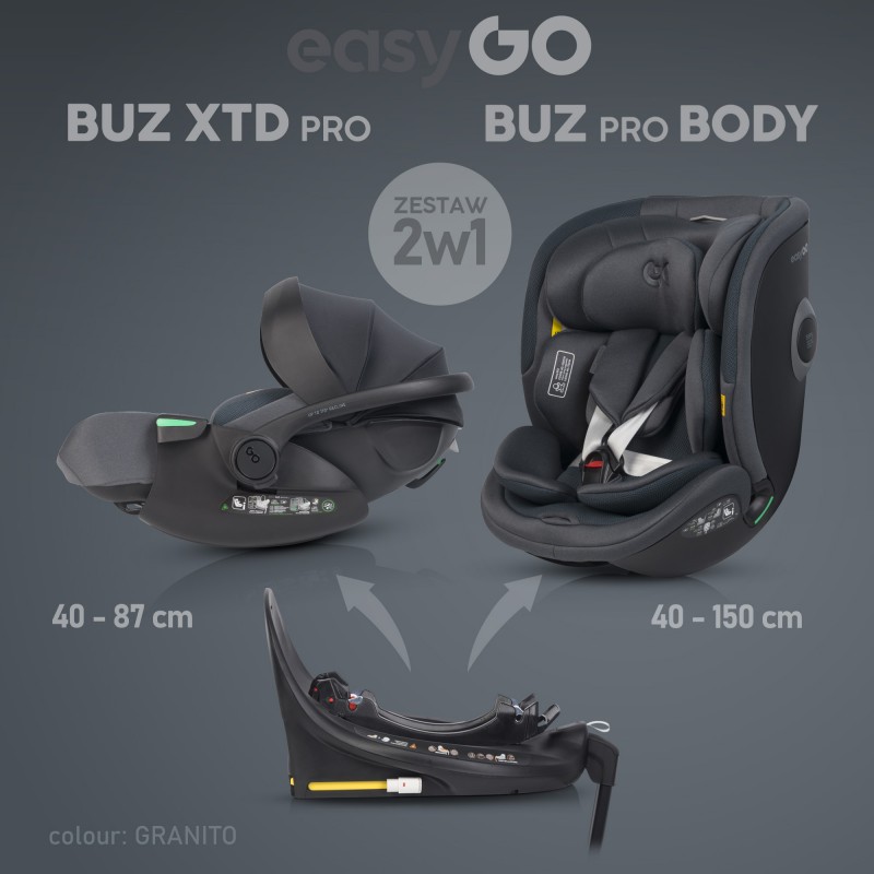Zestaw 2w1 fotelików samochodowych EasyGo BUZ XTD PRO (40-87 cm) i BUZ PRO BODY (40-150 CM) I-SIZE – dwa foteliki z jedną baza ISOFIX