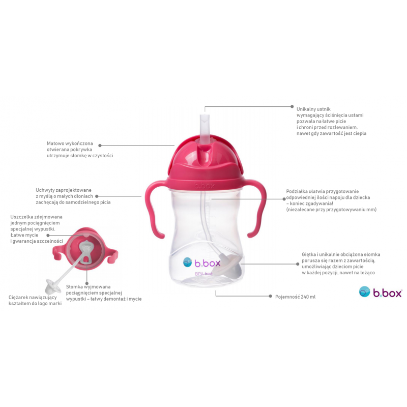 Przedstawiamy ulepszoną wersję bidonu b.box z obciążoną słomką, która pozwoli twojemu maluszkowi wypić napój do ostatniej kropli. To chyba jedyny bidon na rynku, z którego dziecko może pić tak jak z butelki, przechylając go do góry nogami. Sama słomka wyposażona jest w unikalny dwukierunkowy zawór oraz wzmocnioną pokrywkę, co razem z uszczelką zapewnia szczelność.