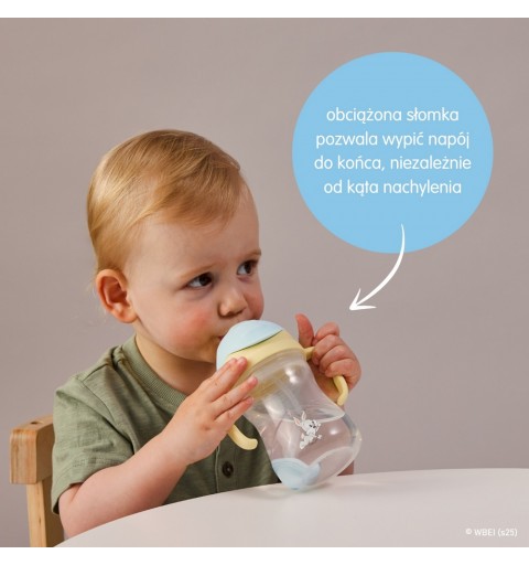 Niezastąpiony kubek do picia w domu, w podróży, na spacerze. Doskonale nadaje się do szlifowania umiejętności samodzielnego picia. Razem z akcesoriami dodatkowymi*: podwójną miseczką na ulubione przekąski oraz podróżnym śliniakiem stanowią świetny „posiłkowy niezbędnik”. Praktycznym i wydłużającym okres korzystania z bidonu rozwiązaniem są wymienne słomki i specjalnie zaprojektowana szczoteczka umożliwiająca ich dokładne czyszczenie (zestaw słomek ze szczoteczką sprzedawany osobno).