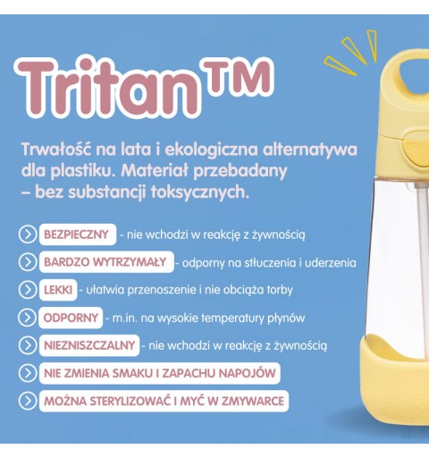 Materiał: Tritan™ - nowoczesne tworzywo sztuczne o właściwościach zbliżonych do szkła, całkowicie wolne od BPA, nie zmienia smaku napojów, silikon, PP
