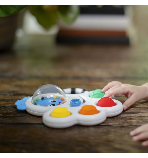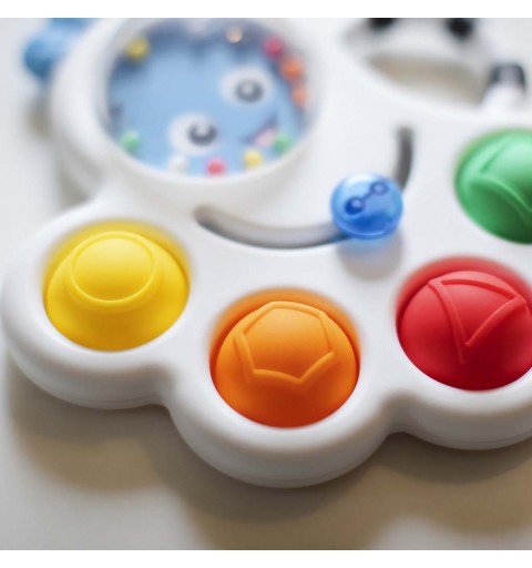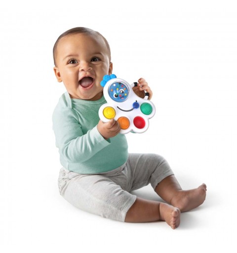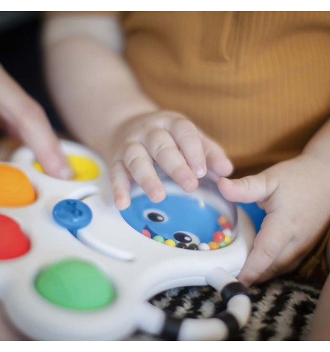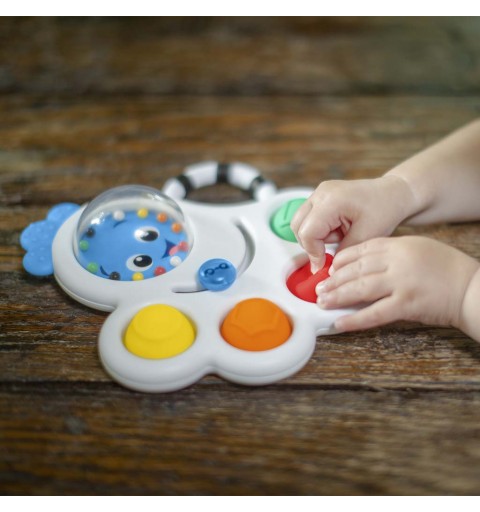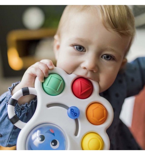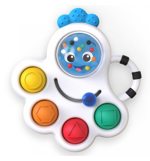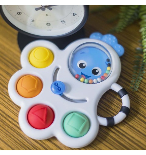 Zabawka 3 w 1 Opus Shape Pops™ to gryzak, grzechotka i zabawka sensoryczna, która z pewnością przyciągnie i zatrzyma uwagę dziecka. Twój maluch może odkrywać kolorowe i miękkie bańki, przesuwać niebieski suwak, aby usłyszeć dźwięk kręcenia, potrząsać wielokolorowymi koralikami grzechotki w kuli i ukoić obolałe dziąsła gryzakiem będącym na górze zabawki.