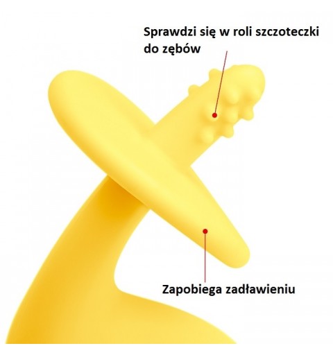 Miękki gryzak dla dzieci tańczący słonik został zaprojektowany z myślą o bezpieczeństwie najmłodszych dzieci. Gryzak silikonowy dla dzieci zakończony jest wypustkami masującymi delikatne dziąsełka. W efekcie łagodzi ból i swędzenie podczas ząbkowania. Gryzak dla dzieci Dancing Elephant posiada odpowiedni kształt i rozmiar dopasowany do maleńkich rączek. Silikonowy gryzak posłuży maluszkowi również jako szczoteczka do zębów. Nasze produkty spełniają restrykcyjne międzynarodowe normy, dlatego też nie ma możliwości zadławienia się przez maluszka. Kształt gryzaka i jego kolorystyka zachęcą maluszka do zabawy, w wyniku czego zapomni o dyskomforcie związanym z ząbkowaniem. Można używać go w zmywarce, mikrofalówce, a także zamrażarce.