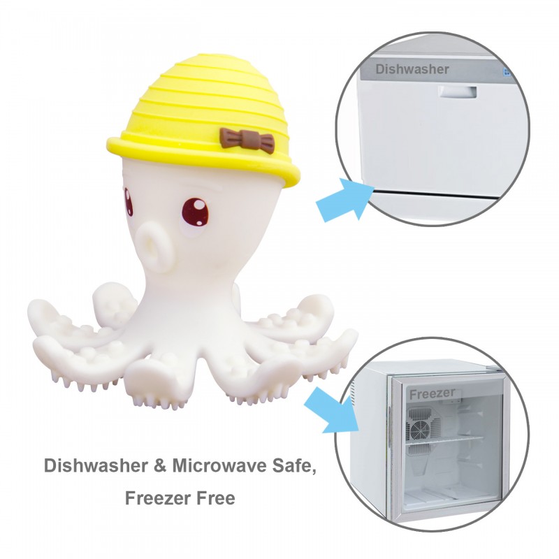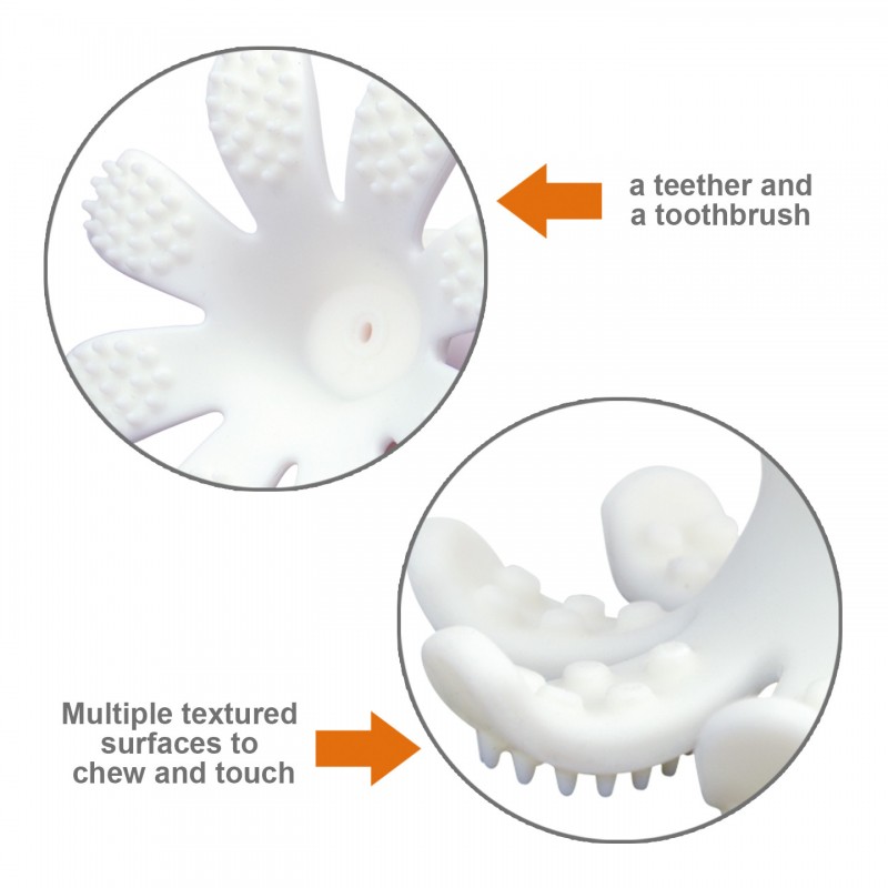 Silikonowy gryzak dla dziecka wykonany w wersji 3D. To idealny pierwszy gryzak dla niemowlaka, ponieważ został zaprojektowany w taki sposób, aby Twoje Maleństwo nie mogło się zadławić. Uroczy gryzak dla dziecka w postaci ośmiorniczki stanie się ulubionym przyjacielem w czasie ząbkowania. Jej konstrukcja zapewnia dziecku wiele sposobów na zabawę. Gładka powierzchnia może posłużyć do ssania, można zrobić z niej kulkę. Osiem macek, w które został wyposażony gryzak dla dziecka posiada wypustki służące zarówno jako gryzak oraz szczoteczka do zębów. Odpowiedni kształt i rozmiar umożliwiają dziecku łatwe jej chwytanie. Gryzak dla niemowlaka można używać w zmywarce, mikrofalówce, a także zamrażarce. Ośmiorniczka zapakowana w przeźroczyste, sztywne opakowanie, będzie idealnym prezentem.
