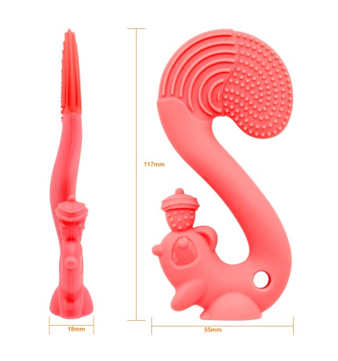 Miękki silikonowy gryzak dla niemowlaka w kształcie wesołej wiewiórki. Gryzak dla dzieci w formie literki "S" zainteresuje maluszka i ochroni go przed zadławieniem. Różnorodne struktury gryzaka masują delikatne dziąsełka i łagodzą ból podczas ząbkowania. Gryzak dla niemowlaka wykonano w odpowiednim kształcie i rozmiarze, dzięki czemu jest idealnie dopasowany do malutkich rączek. Może być również stosowany do podawania np. kaszek i przecierów. Kształt wiewiórki i jej kolorystyka zachęcą Malucha do zabawy. Gryzak dla dzieci jest bezpieczny i łatwy w gryzieniu nawet po ochłodzeniu. Można używać go w zmywarce, mikrofalówce, a także zamrażarce.
