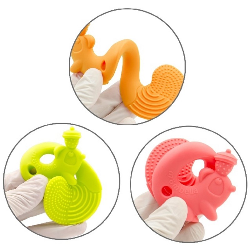 Mömbella® to bezpieczne i komfortowe wybawienie Twojego maluszka, ponieważ na każdym etapie produkcji, gryzak silikonowy jest sprawdzany zgodnie z obowiązującymi i restrykcyjnymi normami wykonania. Ząbkowanie to trudny okres dla każdego maluszka, zwykle jego pierwsze objawy zauważamy od siódmego do ósmego miesiąca życia. Ból z nim związany jest zróżnicowany, lecz jedno jest pewne możesz ulżyć swojemu Maluszkowi. Gryzak silikonowy pomaga przejść dziecku przez okres ząbkowania. Dodatkowo jego ciekawy kształt, faktura i kolorystyka pozytywnie wpływają na rozwój umysłowy. Gryzak silikonowy dzięki ciekawej formie odwraca uwagę dziecka, pozwalając mu na zapomnienie o doskwierającym bólu związanym z ząbkowaniem.