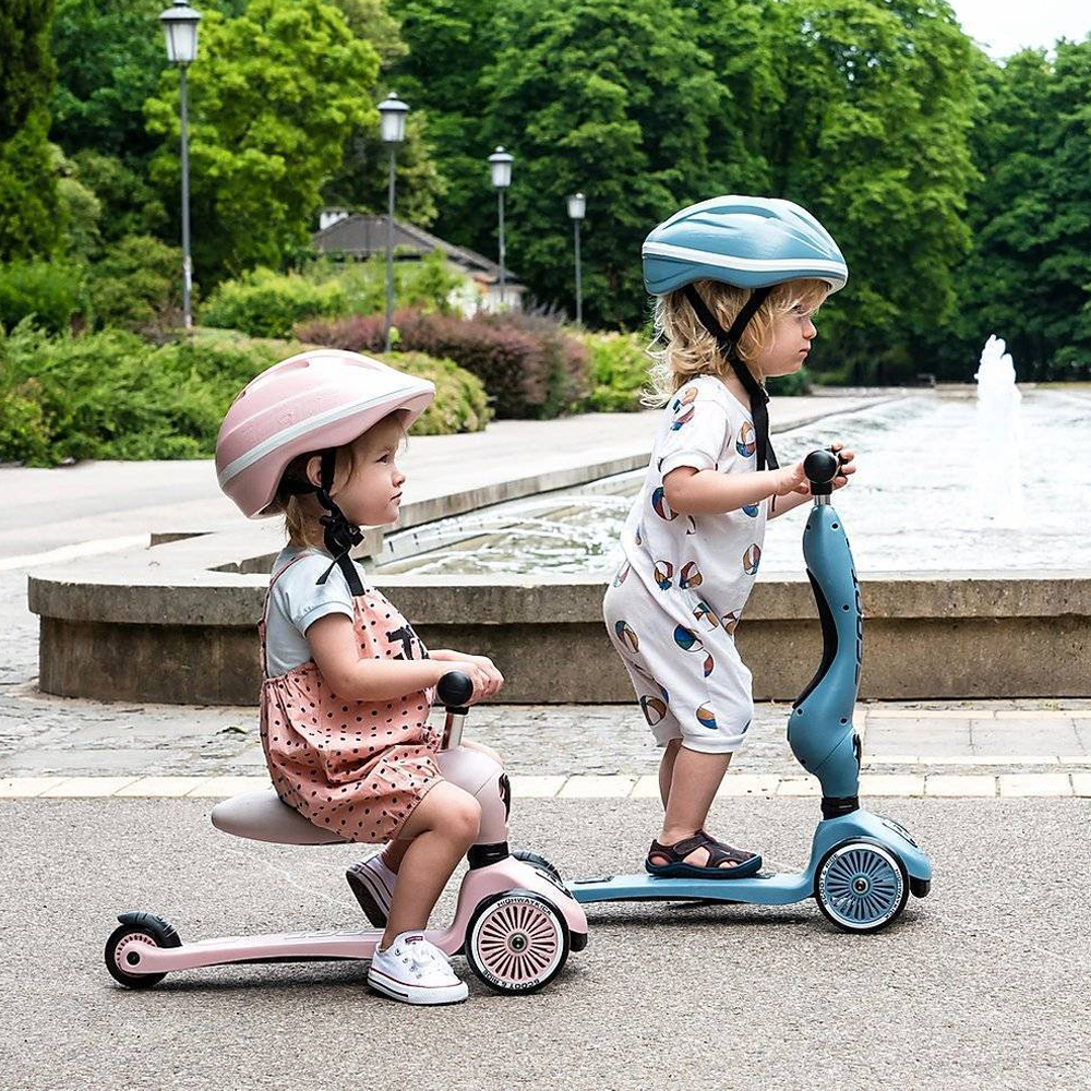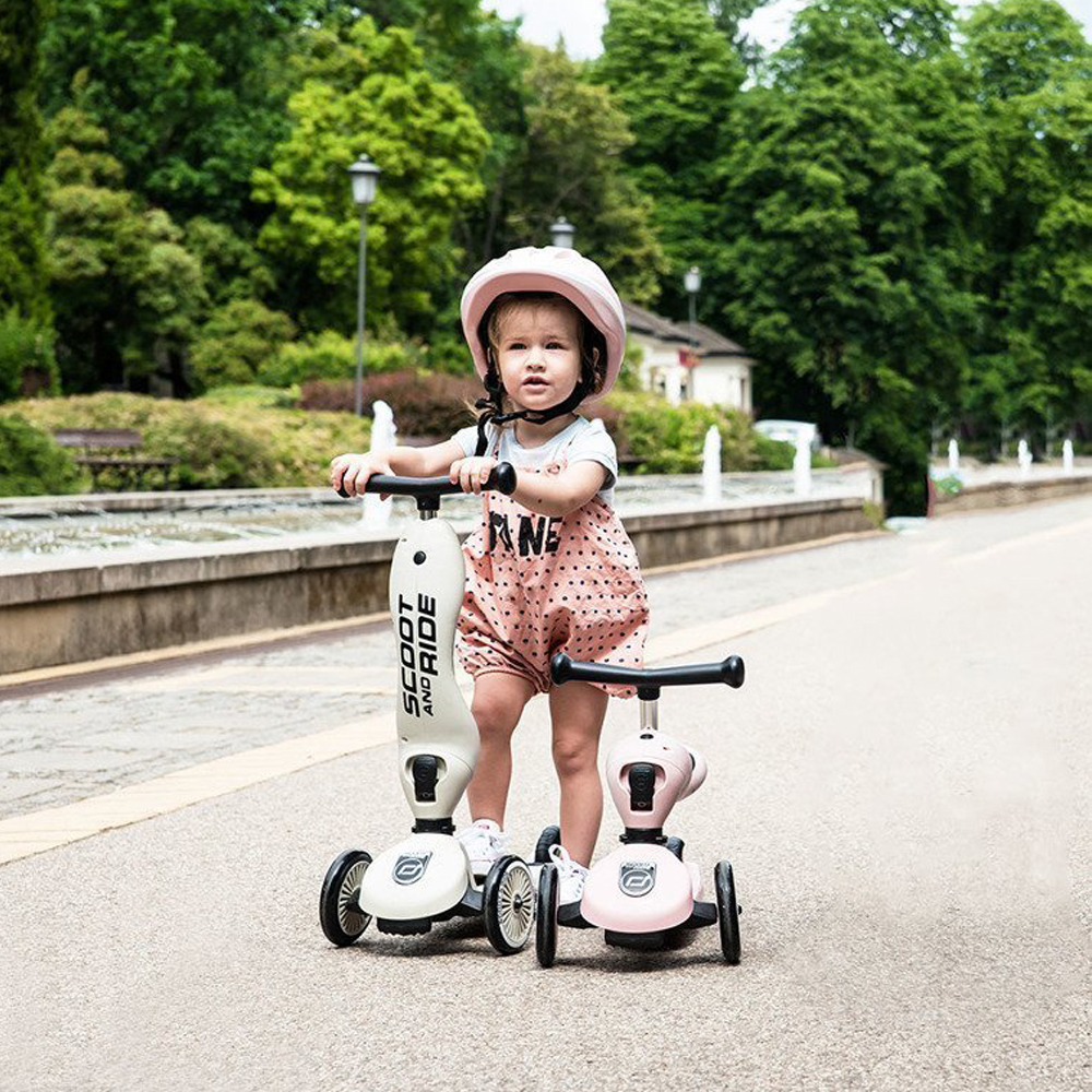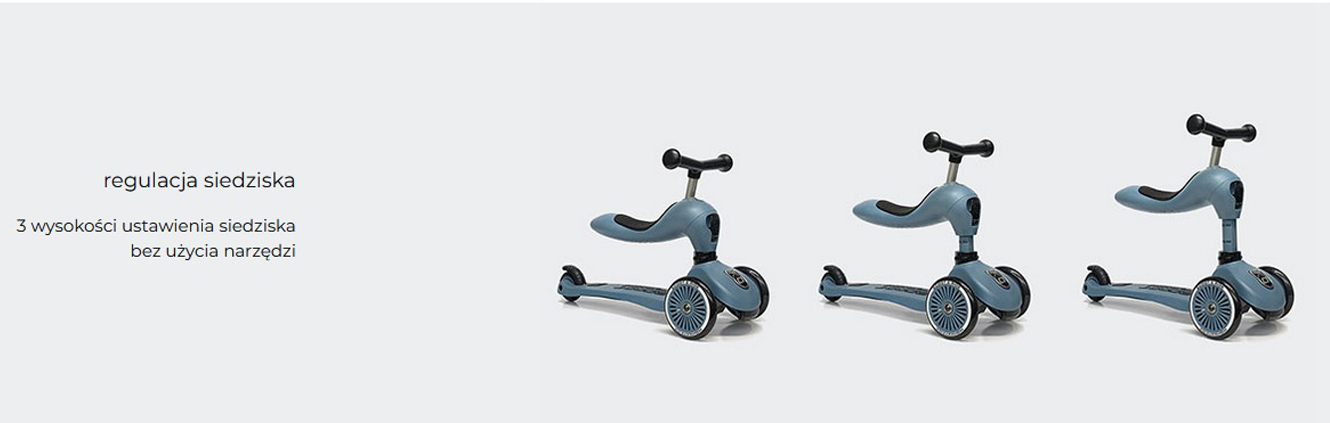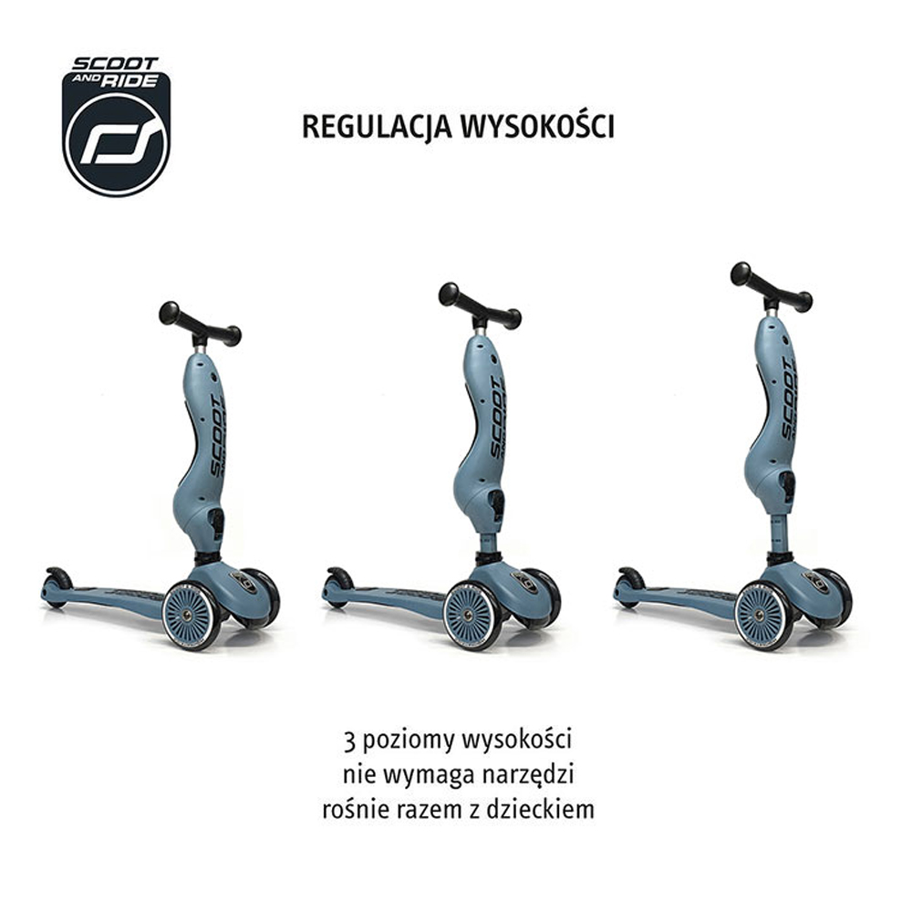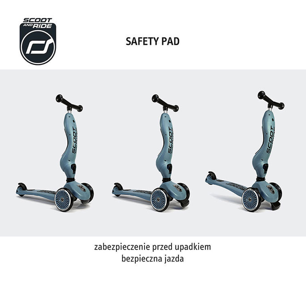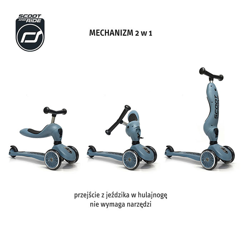 Highwaykick 1 to innowacyjna hulajnoga z siedziskiem. Idealny towarzysz dla dzieci w wieku od 1 roku życia do 5 lat. To pierwszy na świecie jeździk i hulajnoga 2w1, które można modyfikować bez użycia narzędzi. Posiada regulowaną wysokość siedziska, a jego najniższa pozycja dostosowana jest do wzrostu stawiających pierwsze kroki maluszków i znajduje się na wysokości 22,5 cm. Za pomocą jednego guzika, w kilka sekund, można zamienić pojazd w hulajnogę na 3 kołach. Highwaykick 1 jest niezwykle stabilna, wygodna i bezpieczna nawet dla najmłodszych dzieci. Hulajnoga wyposażona została w opatentowany, rewolucyjny system safety-pad, która zapobiega m. in. przewróceniu się na nierównym terenie czy utknięciu kół. Scoot & Ride Highwaykick 1 stanie się towarzyszem zabaw Twojego dziecka na wiele lat.