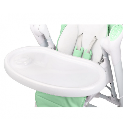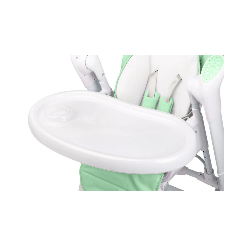 + obszerne oparcie rozkłada się do pozycji leżącej (niezależnie od siedziska – 4 stopnie regulacji) – dziecko ma zapewnioną wygodę podczas posiłku i relaksu