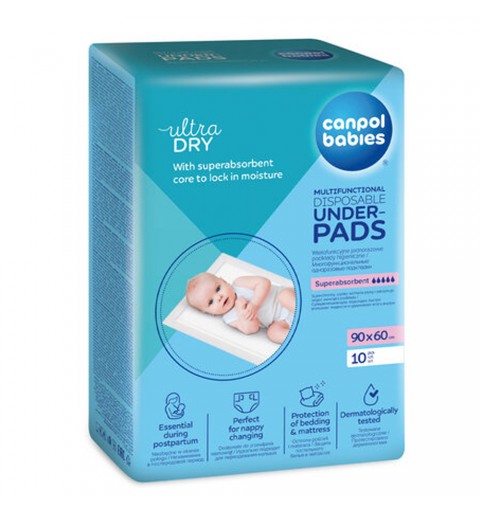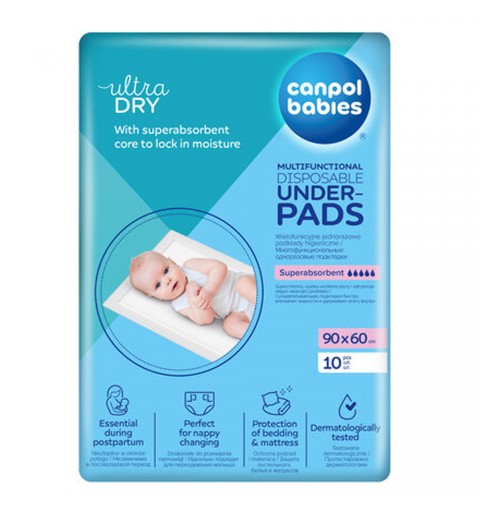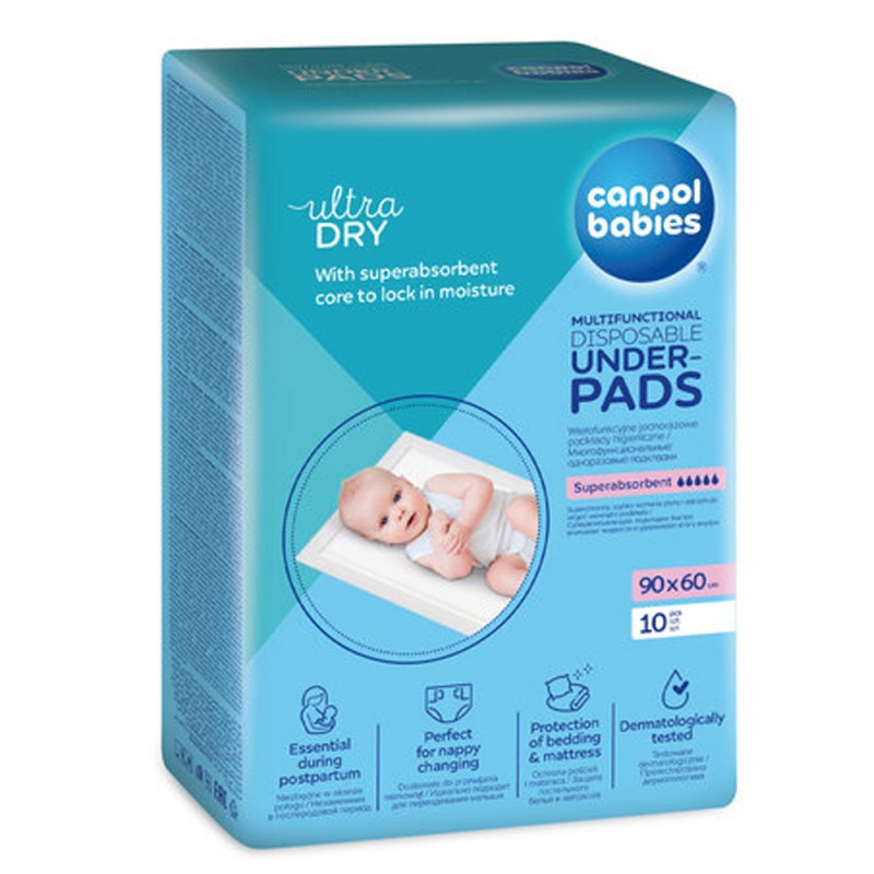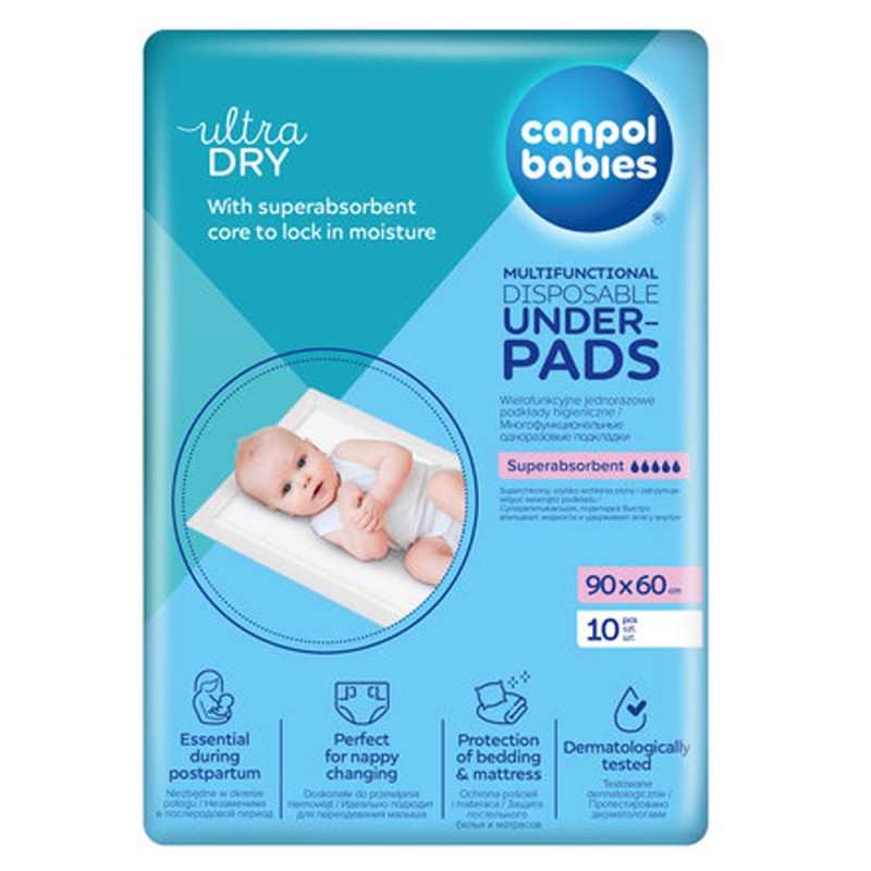 Wielofunkcyjne podkłady higieniczne z wodoodporną warstwą izolacyjną, doskonale zabezpieczają pościel i materac przed zabrudzeniem. Miękka, zewnętrzna powłoka jest delikatna dla skóry. Podkład posiada super chłonny wkład, który zatrzymuje wilgoć wewnątrz i dodatkowo neutralizuje zapachy. Doskonale sprawdzi się podczas codziennych zabiegów pielęgnacyjnych dziecka, nauce odpieluchowania oraz w czasie połogu. W opakowaniu 10 sztuk. Rozmiar: 90x60cm.