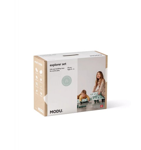 Eksploruj świat MODU! Ten zestaw oferuje co najmniej 15 budowli, a otwartym umysłom gwarantuje nieskończoną ilość kreatywnych kreacji. Rozwiń zdolności motoryczne swojego dziecka otwartą zabawą z MODU. Budujcie zabawne pojazdy, bujane koniki, stwórzcie deskaę balansującą albo cokolwiek twórczego podpowie Wam wyobraźnia. Explorer set sprawdzi się w przypadku niemowląt i małych dzieci - wszystkich gotowych na przygodę: w tym rodziców! To średni zestaw, który zapewni Twojemu dziecku godziny zabawy.