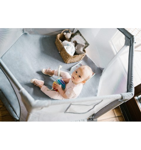 Zastosowana przejrzysta i jednolita siatka umożliwia dziecku obserwowanie otoczenia, zapewnia odpowiednią wentylację oraz gwarantuje, że zabawki umieszczone w kojcu pozostaną wewnątrz.