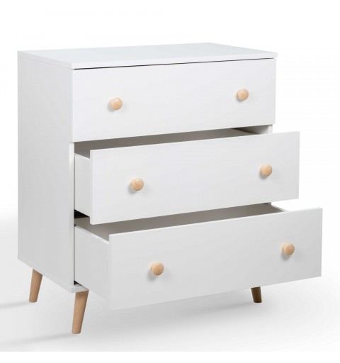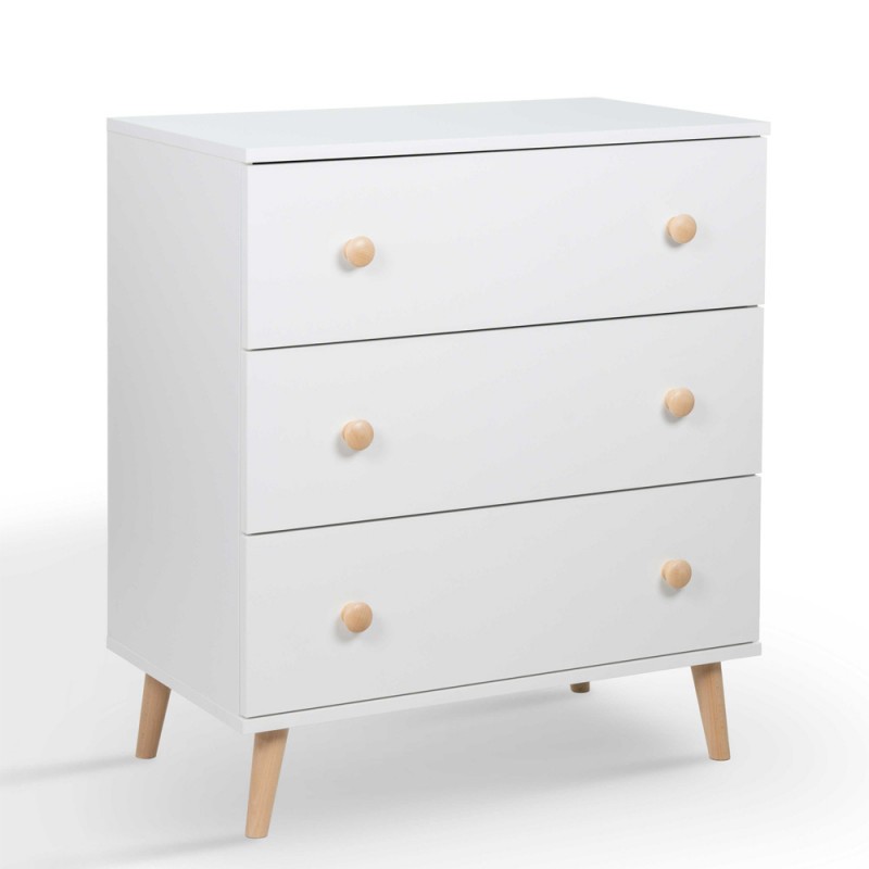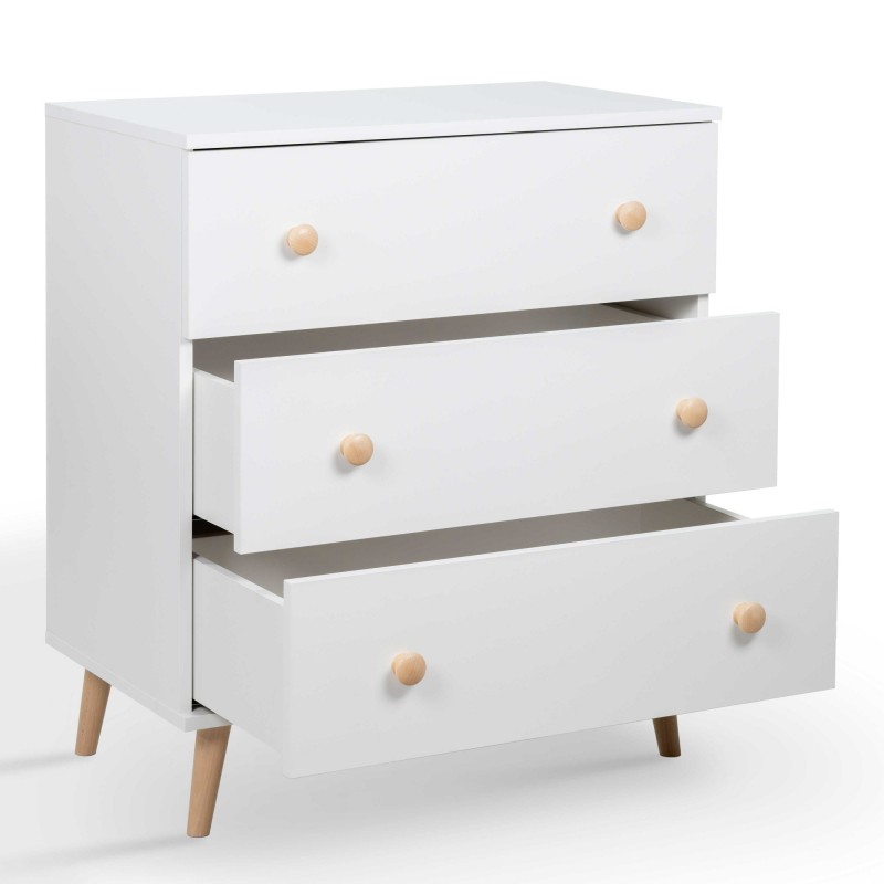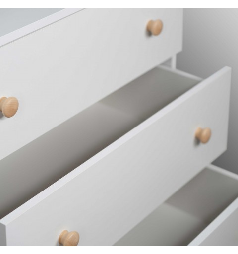 Nakładkę na przewijak możemy umieścić w dowolnej części blatu komody, dzięki czemu jesteśmy w stanie wygospodarować na nim dodatkowe miejsce np. na koszyczek z niezbędnymi kosmetykami. Trzy pojemne szuflady pomieszczą dziecięcą wyprawkę, dzięki czemu wszystkie ubranka i pieluszki będą w zasięgu Twojej ręki.