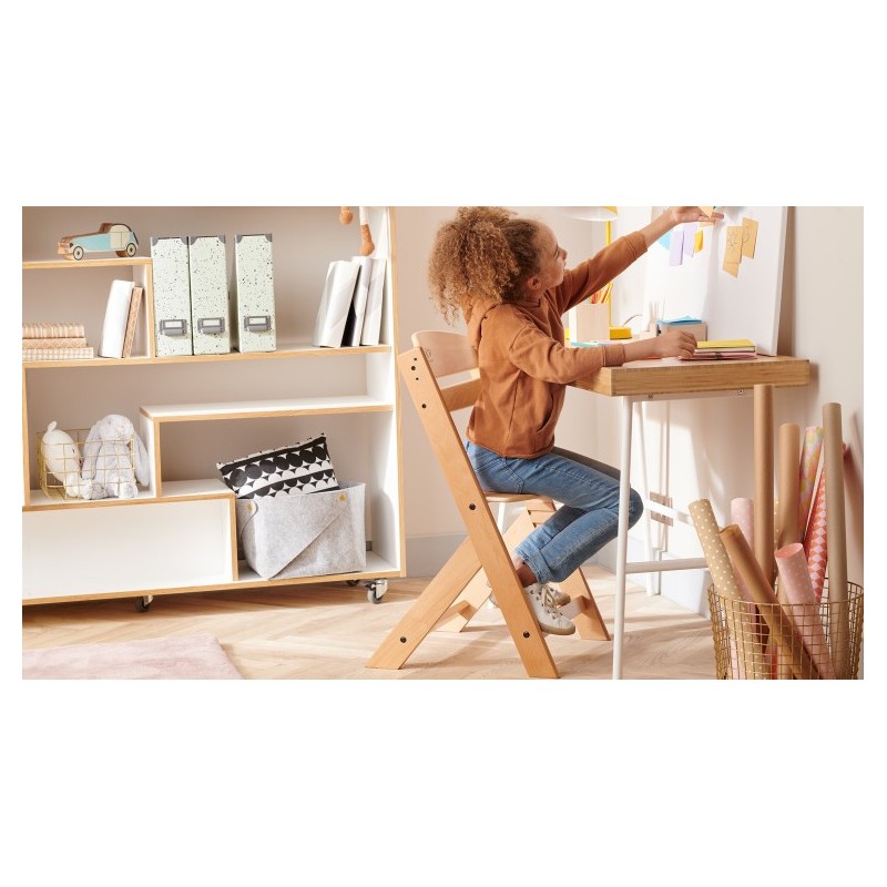 ENOCK to wytrzymałe, wielofunkcyjne krzesełko dla dzieci od 6 miesiąca życia do 10 lat. Będzie towarzyszyć twojemu maluchowi od momentu, w którym zacznie siedzieć, aż do czasu odrabiania szkolnych lekcji. Krzesełko do karmienia 2 w 1 ENOCK wyróżnia się ponadczasową stylistyką oraz szerokim zakresem regulacji, dzięki czemu będzie pasować zarówno do stołu w jadalni, jak i dziecięcego biurka. Solidne wykonanie z litego drewna bukowego gwarantuje trwałość na długie lata. Wygodny system regulacji, uwzględniający kilka poziomów siedziska i podnóżka, zapewnia optymalne dopasowanie do dziecka. Oparcie siedziska ma ergonomiczną formę, a samo siedzisko jest szerokie i głębokie. Zapewnia maluchowi wygodę podczas pierwszych prób samodzielnego jedzenia i później, gdy będzie się bawił przy stole. Drewniana konstrukcja krzesełka jest bardzo stabilna, a dodatkowo łatwa w czyszczeniu.