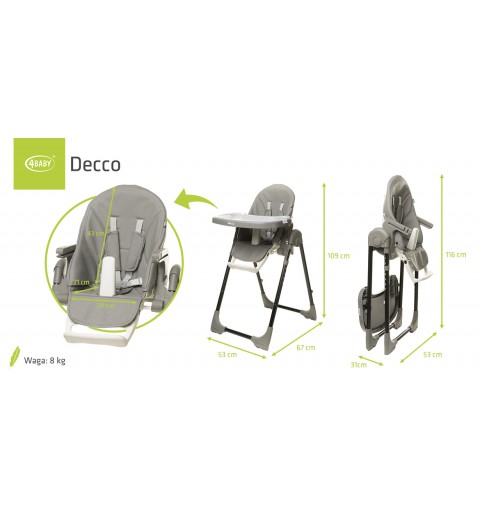 DECCO to funkcjonalne krzesełko do karmienia w nowoczesnej stylistyce połączone z klasyczną elegancją. Miękka tapicerka z eko-skóry zapewnia wygodę i łatwość czyszczenia, a praktyczne dwie tace z miejscem na kubek lub butelkę ułatwiają podawanie napojów maluszkowi. Posiada pięciopunktowe pasy z osłonkami na ramiona i dodatkowym element zabezpieczającym przed wyślizgnięciem się z krzesełka. Krzesełko Deco jest rekomendowane dla dzieci do maksymalnej masy ciała 15 kg i wieku 6-36 miesięcy.