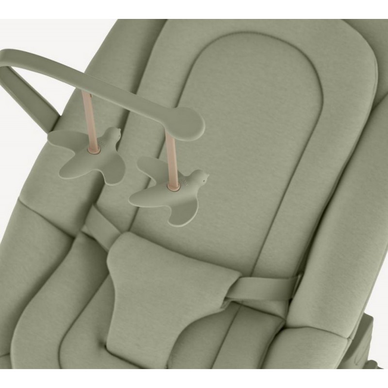 Siedzisko dla noworodka wyposażone jest w zabawki o kontrastowych kształtach i kolorach, które delikatnie stymulują wzrok oraz rozwój sensoryczny dziecka od pierwszych tygodni życia.