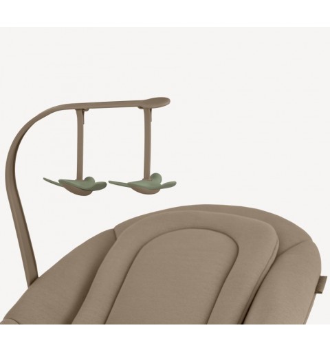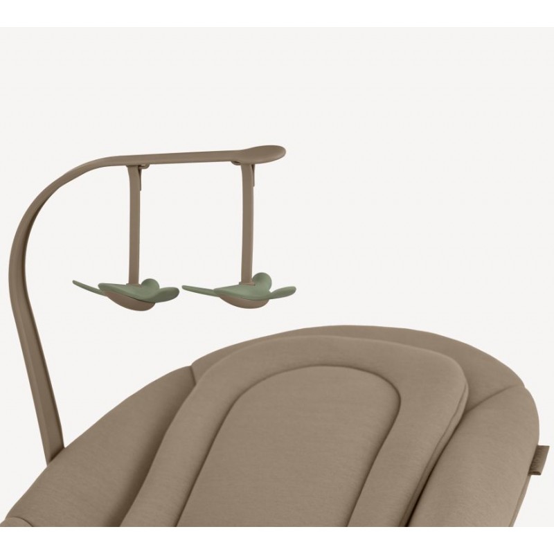 Siedzisko dla noworodka wyposażone jest w zabawki o kontrastowych kształtach i kolorach, które delikatnie stymulują wzrok oraz rozwój sensoryczny dziecka od pierwszych tygodni życia.