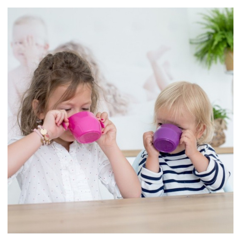 Kultowy przechylony kubeczek do nauki picia dla dzieci w nowej odsłonie. Ten lekki i poręczy kubek, kochany przez dzieci i chętnie kupowany przez rodziców, został uzupełniony o innowacyjne rozwiązania. Zakrzywiona krawędź stanowiąca oparcie dla zębów i szerokie wygodne uchwyty to ukłon w stronę starszych dzieci. Naczynie może służyć zarówno do nauki picia wody, ale również innych płynów, w tym zup kremów.