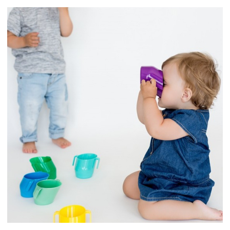 Kultowy przechylony kubeczek do nauki picia dla dzieci w nowej odsłonie. Ten lekki i poręczy kubek, kochany przez dzieci i chętnie kupowany przez rodziców, został uzupełniony o innowacyjne rozwiązania. Zakrzywiona krawędź stanowiąca oparcie dla zębów i szerokie wygodne uchwyty to ukłon w stronę starszych dzieci. Naczynie może służyć zarówno do nauki picia wody, ale również innych płynów, w tym zup kremów.