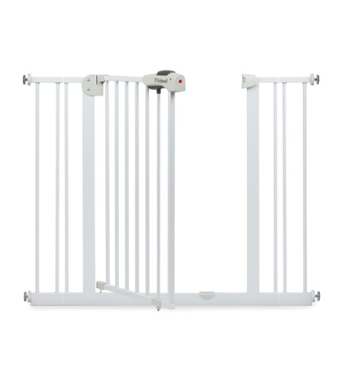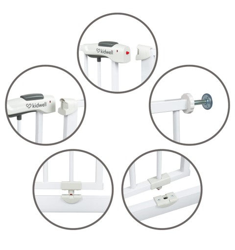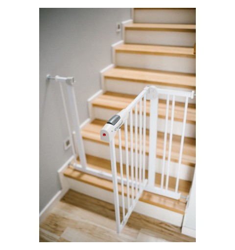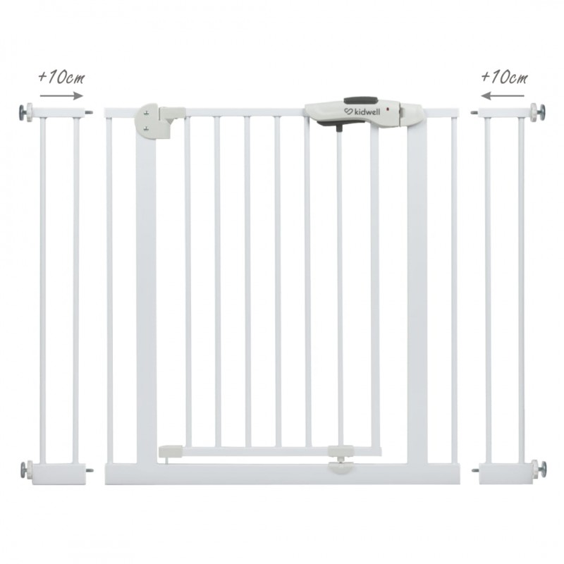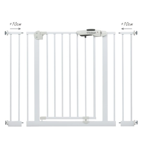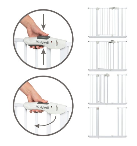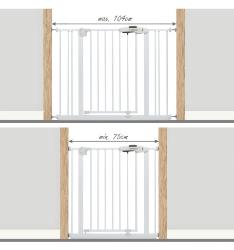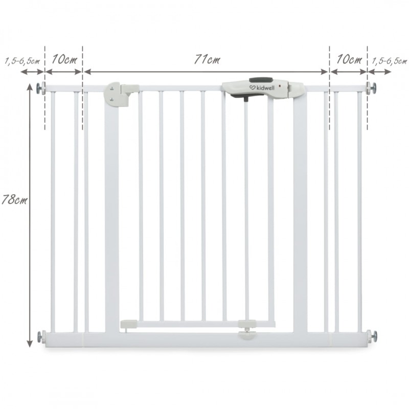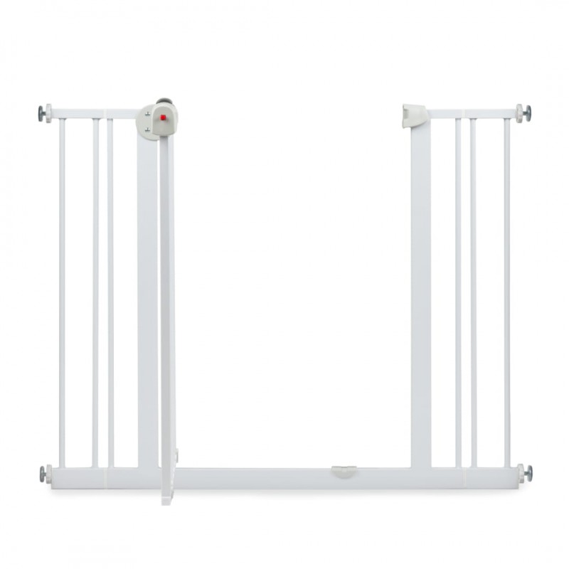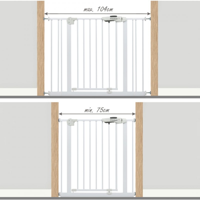 Szerokość bramki jest regulowana przy pomocy 4 śrub zakończone gumową osłoną, dzięki czemu można dostosować go do różnych miejsc w swoim domu. W zestawie znajdują się również dwa rozszerzenia 10 cm, które pozwalają dostosować bramkę do różnych szerokości futryn i przejść schodowych.