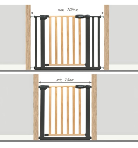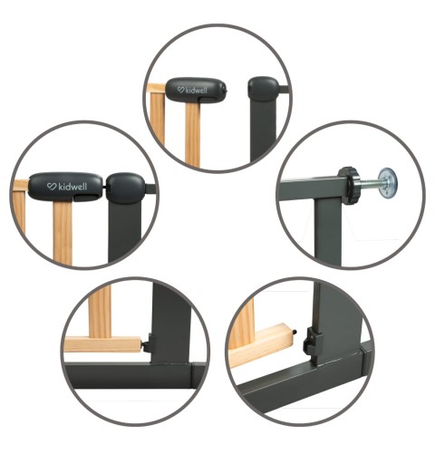 Szerokość bramki jest regulowana przy pomocy 4 śrub zakończone gumową osłoną, dzięki czemu można dostosować go do różnych miejsc w swoim domu. W zestawie znajdują się również dwa rozszerzenia 7 cm oraz 14 cm, które pozwalają dostosować bramkę do różnych szerokości futryn i przejść schodowych.