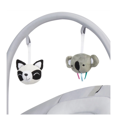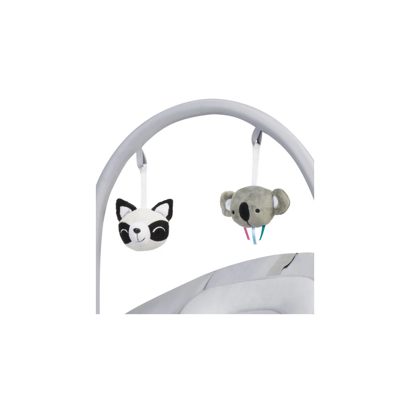 Regulowany pałąk można przyczepić z obu stron. Ma przypinane 2 pluszowe zabawki, które zachwycą malucha. Bujaczka nie można przenosić za pałąk.