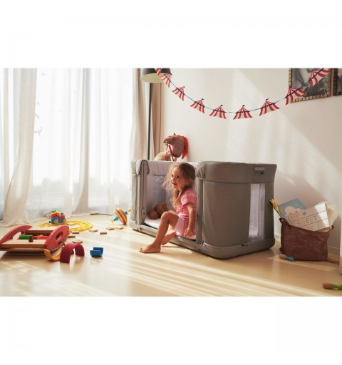 Żeby przekształcić produkt w łóżeczko podłogowe dla malucha, wystarczy odpiąć nogi oraz panel boczny. Dzięki temu dziecko może swobodnie korzystać z łóżeczka, wchodząc i wychodząc z niego samodzielnie i bezpiecznie.