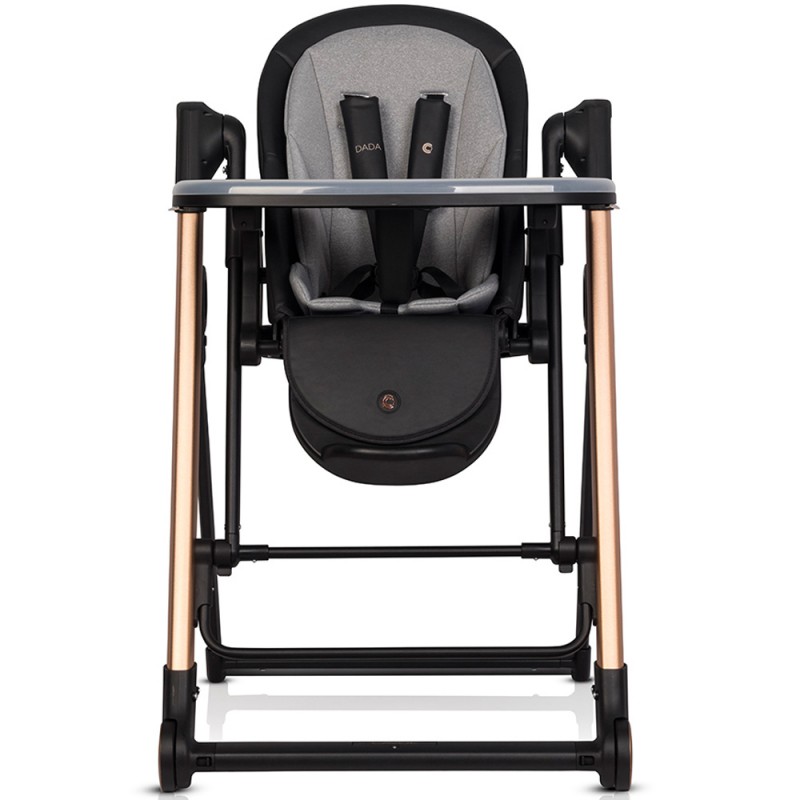 Krzesełko do karmienia DADA posiada najlepszy dostępny na rynku system regulacji oparcia, który jest połączony z wysuwem płaszczyzny siedziska. Taki system zapewnia, że środek ciężkości zawsze pozostaje w tym samym miejscu. Większość krzesełek na rynku posiada zwyczajne regulacje oparcia polegające na zmianie kąta względem siedziska co powoduje przesunięcie środka ciężkości do tyłu, a tym samym mniejszą stabilność. Oparcie można ustawić aż w 5 różnych pozycjach.