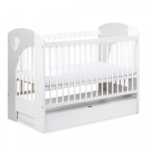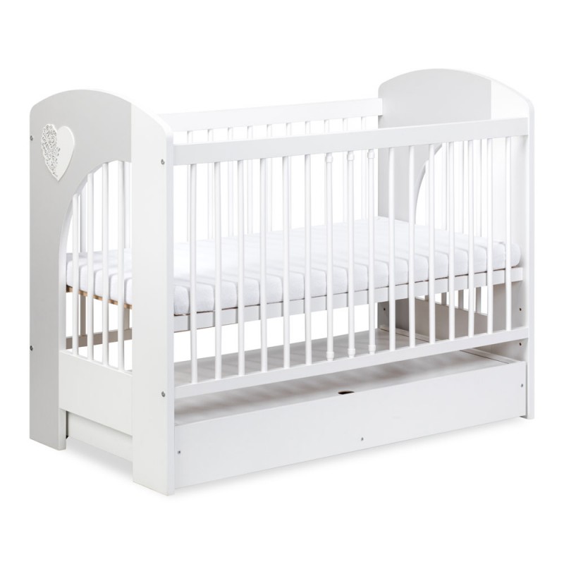Klupś Nel Serce - łóżeczko dziecięce z szufladą, drewniane 120x60 | Biały / Popiel