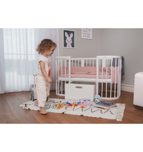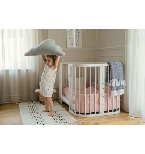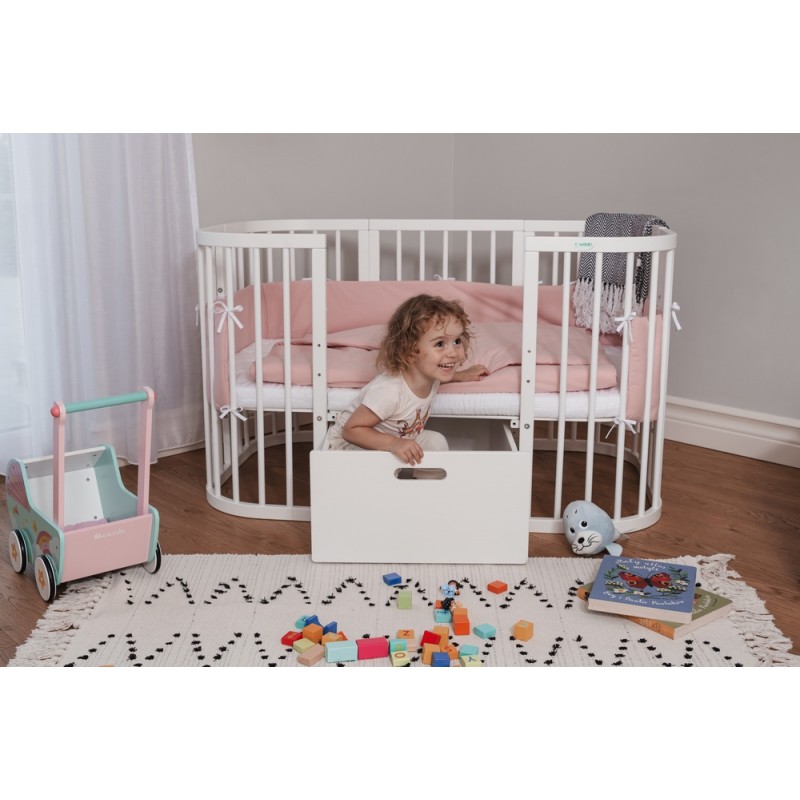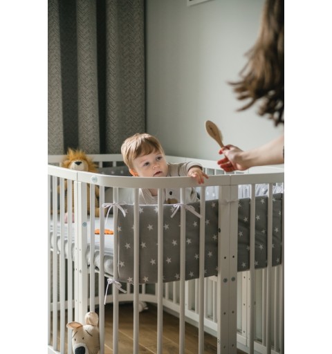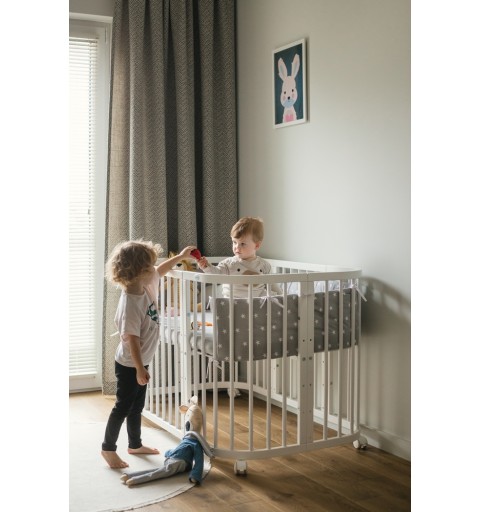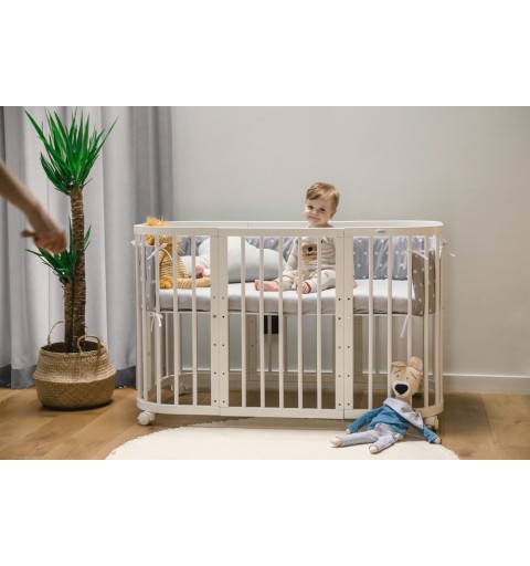 Gdy Twoje dziecko będzie już stabilnie wstawać i eksplorować otaczającą go przestrzeń, łóżko będzie pełnić rolę bezpiecznego kojca. Możesz go ustawić w salonie i przez cały czas mieć oko na zabawę swojego malucha. Konfiguracja łóżka z otwartą barierką i podłogą na ostatnim poziomie sprawdzi się jako łóżeczko dla starszego dziecka, tak aby miało możliwość samodzielnego wejścia i wyjścia z łóżeczka. Ta konfiguracja świetnie sprawdzi się podczas nauki spania we własnym łóżku.