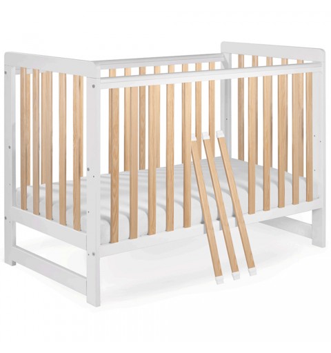 Łóżeczko posiada płaskie szczebelki o szerokości 34 mm. oraz pozaokrąglane krawędzie listew.