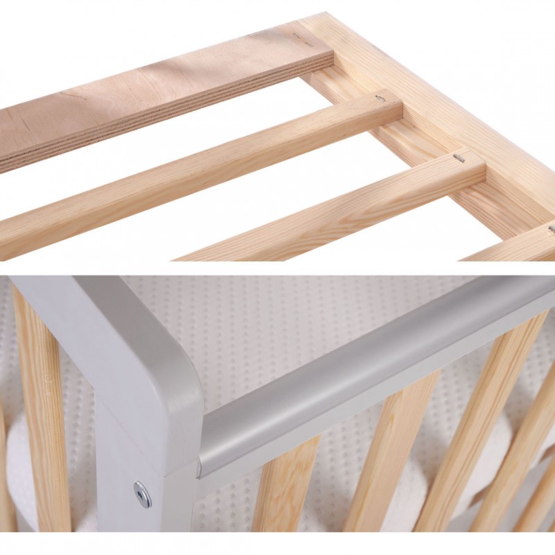 Łóżeczko posiada płaskie szczebelki o szerokości 34 mm. oraz pozaokrąglane krawędzie listew.