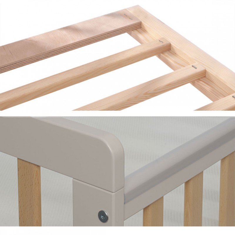 Montaż odbywa się za pomocą złączy, które gwarantują wielokrotny montaż i demontaż łóżeczka.