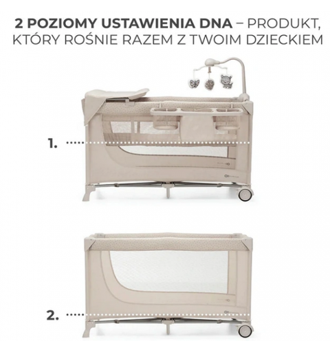 Łóżeczko 3 w 1 JOY 2 z akcesoriami ma możliwość ustawienia dna na jednym z 2 poziomów: najwyższy przeznaczony jest dla niemowląt – dzięki niemu nie będziesz musiał schylać się na sam dół za każdym razem, gdy maluszek się obudzi. A gdy dziecko zacznie się obracać albo siadać, wystarczy opuścić dno na najniższy poziom, by dziecko było bezpieczne. JOY 2 z akcesoriami ma dwa praktyczne kółka, które ułatwiają przesuwanie łóżeczka z pokoju do pokoju – będziesz mieć malca zawsze blisko siebie.