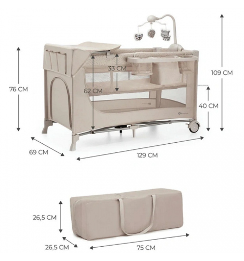 W skład zestawu wchodzi karuzela z dźwiękiem, światełkami i 3 zabawkami, torba do przenoszenia, przewijak, organizer, podwieszana podłoga z wypenieniem zastępująca materac