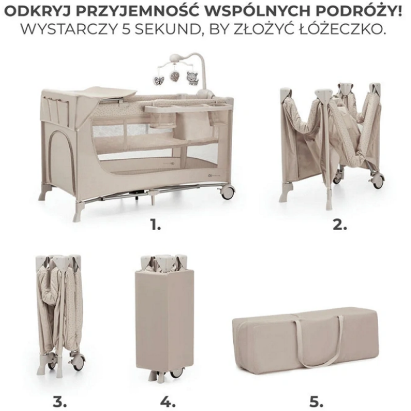 Łóżeczko złożysz w 5 sekund do kompaktowych rozmiarów – bez problemu zmieści się do bagażnika samochodu. Do JOY 2 dołączona jest torba z uchwytami, ułatwiająca przenoszenie łóżeczka oraz podwieszana podłoga z wypełnieniem, dzięki czemu nie musisz dokupować osobnego materaca. Dzięki niewielkim wymiarom po złożeniu JOY 2 możesz też schować do szafy czy pod łóżko, żeby nie zajmowało miejsca w domu, gdy go nie używasz.