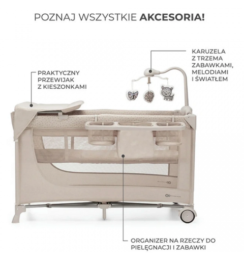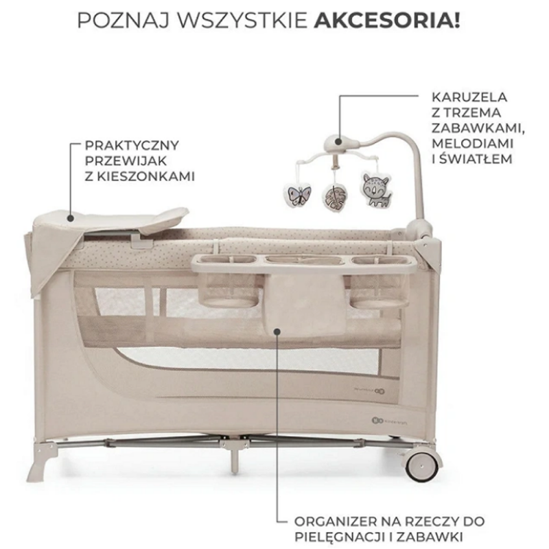 Łóżeczko ma praktyczne akcesoria, które umilą dziecku czas: karuzela z dźwiękiem, światełkami i 3 pluszowymi zabawkami pozwoli maluszkowi ćwiczyć uwagę, skupienie i zachęci do wyciągania rączek. Z kolei rodzice ucieszą się z przewijaka i organizera, który można zawiesić z boku łóżeczka.