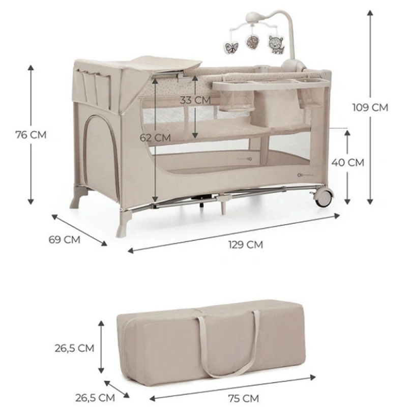 W skład zestawu wchodzi karuzela z dźwiękiem, światełkami i 3 zabawkami, torba do przenoszenia, przewijak, organizer, podwieszana podłoga z wypenieniem zastępująca materac