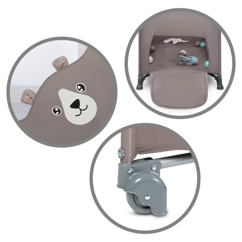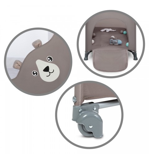 Uroczy miś z odstającymi uszkami dodaje łóżeczku bajkowego charakteru i sprawia, że dziecko z przyjemnością będzie w nim przebywać.