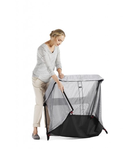 Łóżeczko turystyczne BABYBJÖRN wykonane jest z miękkiej i przewiewnej tkaniny mesh, która pozwala dziecku swobodnie oddychać, nawet jeśli twarz dziecka znajdzie się blisko boków łóżeczka. Dodatkowo siateczka ułatwia opiekunowi obserwację dziecka.