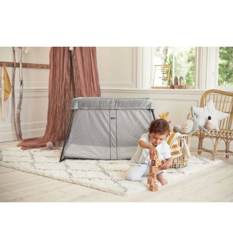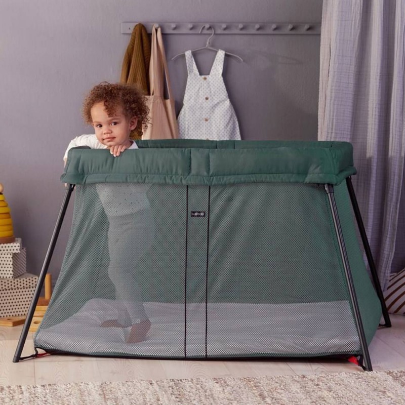 Wygodne i lekkie łóżeczko turystyczne BABYBJORN w zestawie z prześcieradłem do łóżeczka turystycznego LIGHT