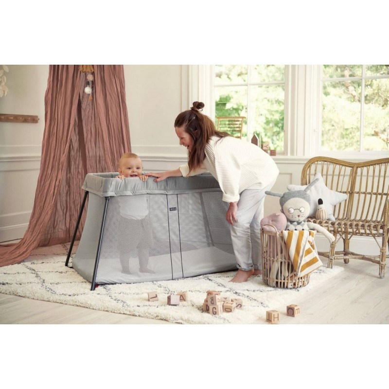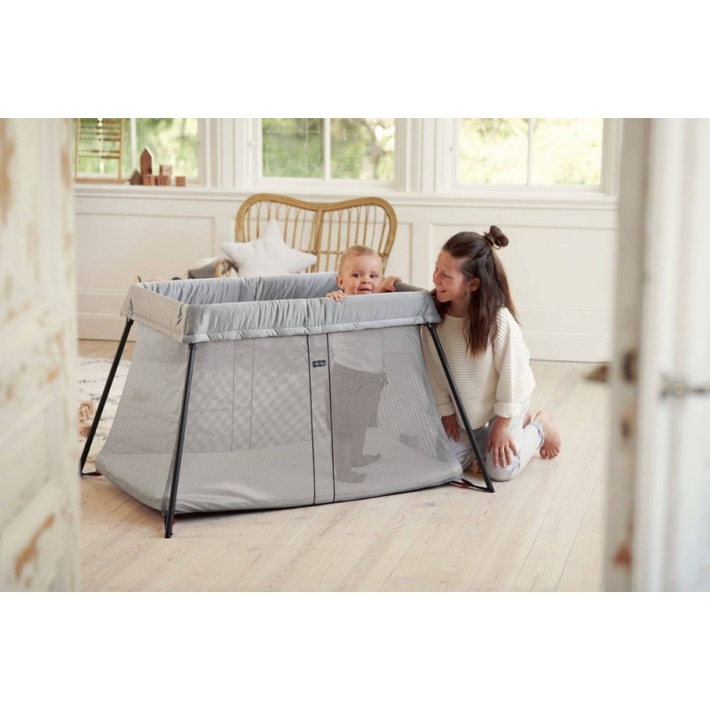 Wygodne i lekkie łóżeczko turystyczne BABYBJORN w zestawie z prześcieradłem do łóżeczka turystycznego LIGHT