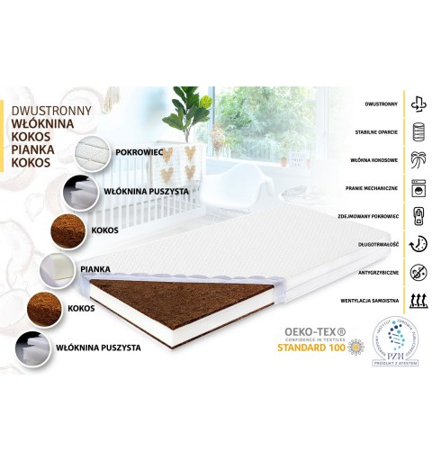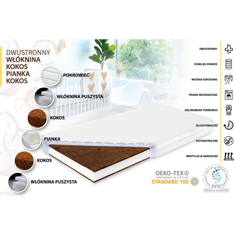 Materac Kokos-pianka-kokos to idealny wybór dla rodziców, którzy szukają komfortowego, grubego oraz trwałego materacyka w przystępnej cenie. Dzięki warstwowej budowie (2 warstwy maty kokosowej w połączeniu z pianką poliuretanową oraz otuliną z włókniny puszystej) i grubości 12,5 cm, zapewni wygodny i spokojny sen. Miękki pokrowiec jest niezwykle trwały, a w razie zabrudzenia, można go łatwo ściągnąć i wyprać. Materacyk posiada pozytywną opinię Państwowego Zakładu Higieny.