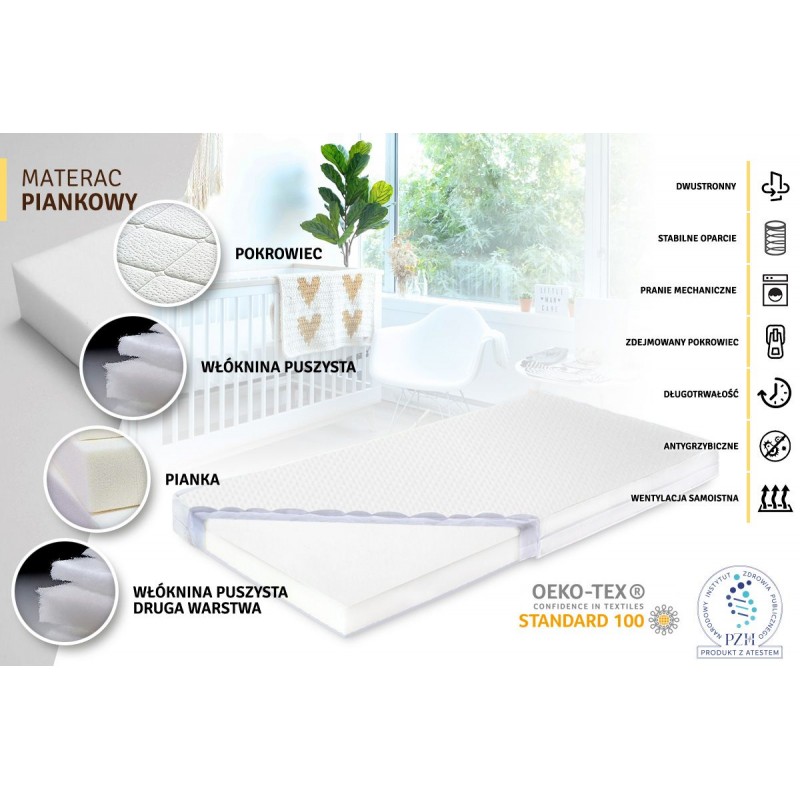 Materac pianka to idealny wybór dla rodziców, którzy szukają komfortowego, grubego i trwałego materacyka w przystępnej cenie. Dzięki piance o grubości 10 cm otulony miękką włókniną puszystą, zapewni wygodny i spokojny sen. Miękki pokrowiec jest niezwykle trwały, a w razie zabrudzenia, można go łatwo ściągnąć i wyprać. Materacyk posiada pozytywną opinię Państwowego Zakładu Higieny.
