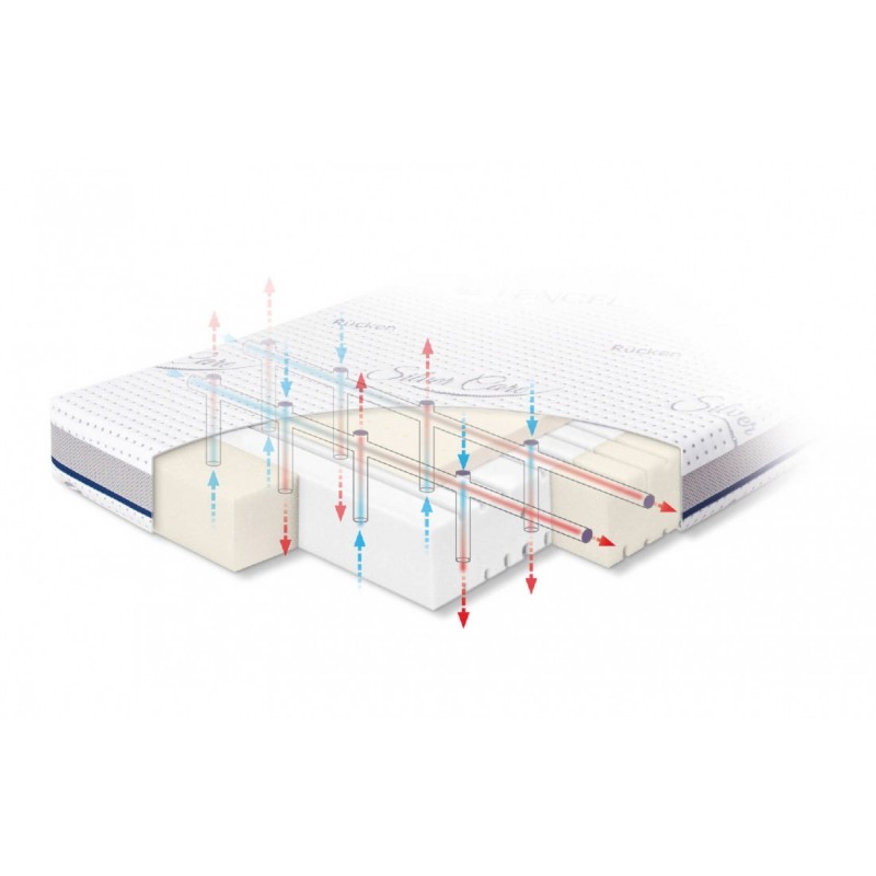 Liczne kanaliki wentylacyjne znajdujące się na obu powierzchniach do spania są zintegrowane z pionowymi kanalikami przechodzącymi przez grubość materaca oraz kanalikami wyciętymi wewnątrz wkładu. Taka budowa umożliwia swobodny napływ powietrza do środka materacyka dziecięcego, przez siatkę napowietrzającą 3D wszytą w pokrowcu