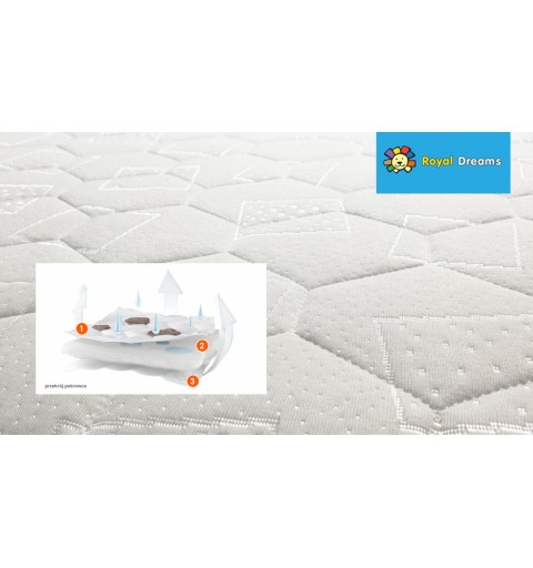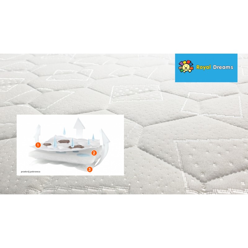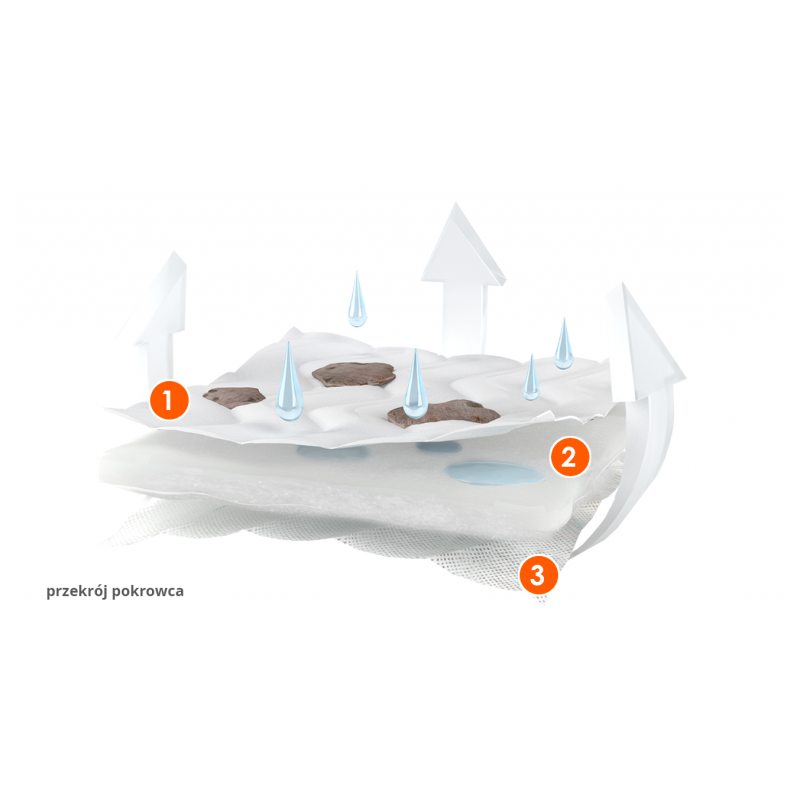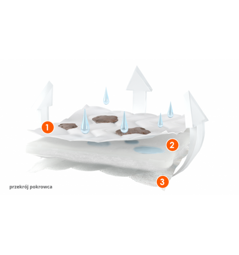 Pokrowiec wykonany jest z (1) dzianiny materacowej (100% poliester), puszystej włókniny poliestrowej (2) i płaskiej włókniny polipropylenowej (3). Wielowarstwowa konstrukcja (3K) pokrowca zapewnia swobodną cyrkulację powietrza i poprawia komfort snu. Chroni wkład materaca przed zabrudzeniami, stałymi zanieczyszczeniami oraz uszkodzeniami.
